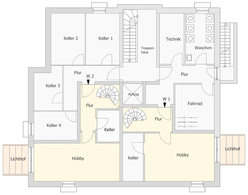 Die Erdgeschosswohnungen verfügen über vielseitig nutzbare Hobbyräume, die beispielsweise als Arbeitszimmer dienen können. Die Wohnungen im Dachgeschoss erstrecken sich über zwei Etagen und verleihen den Wohnungen ein modernes Flair.